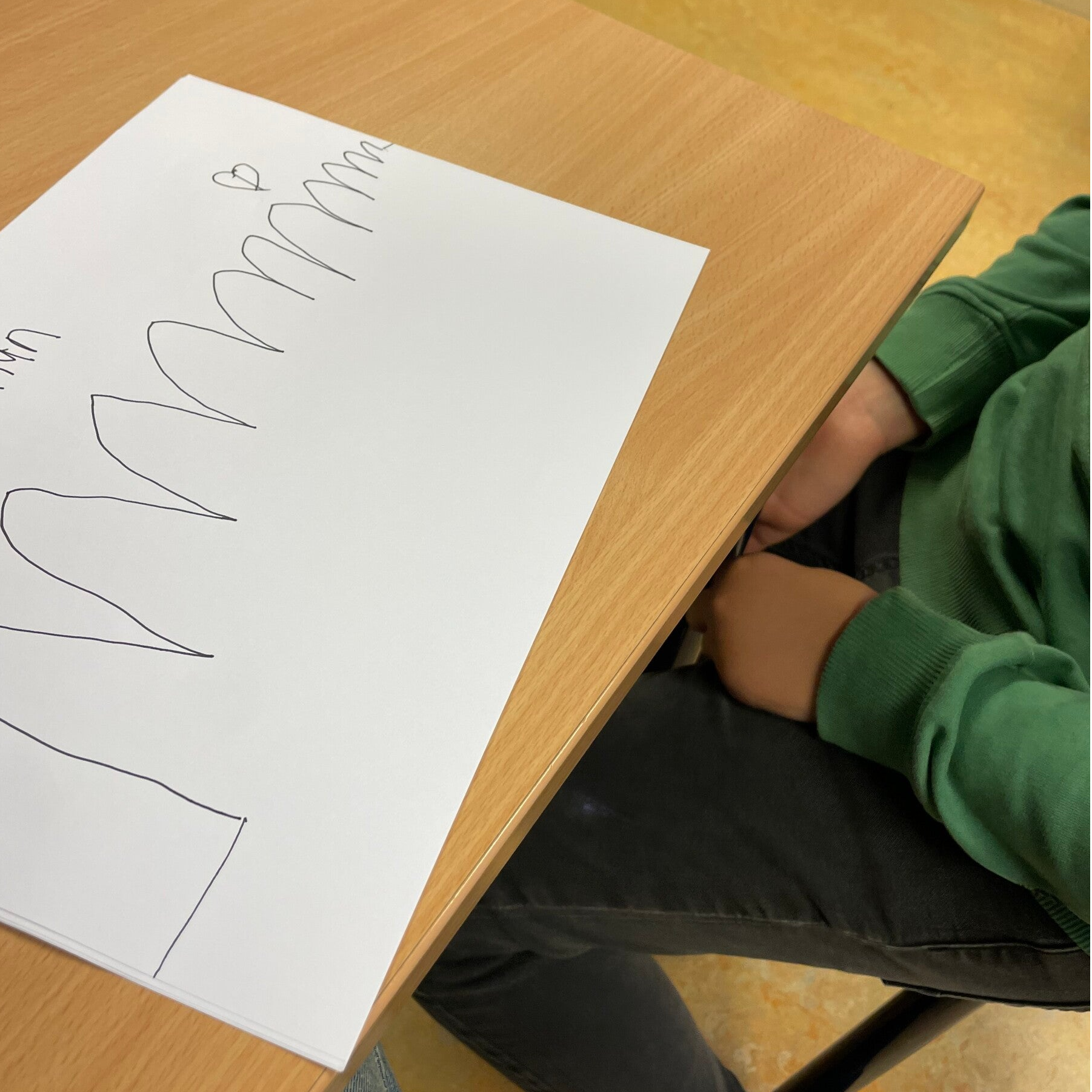 Hij wrijft in zijn ogen en leest toch niet mee. Hij leunt op de tafel en wiebelt op zijn stoel terwijl hij geluid maakt.